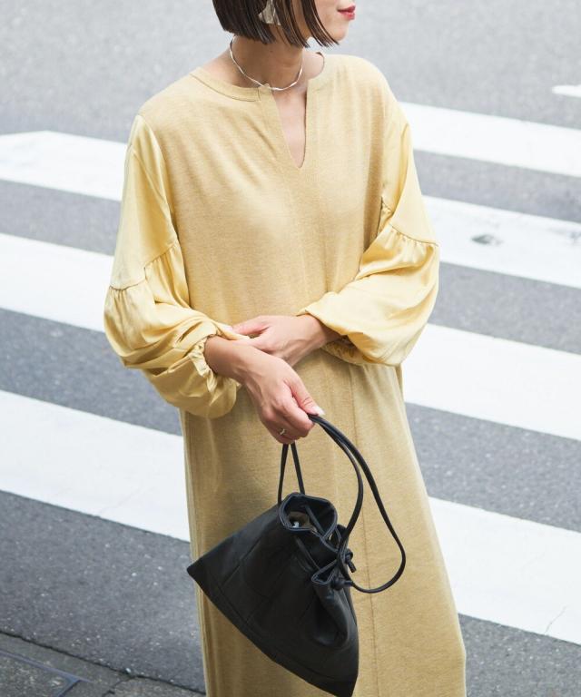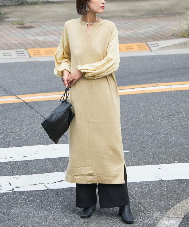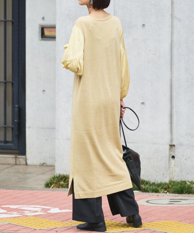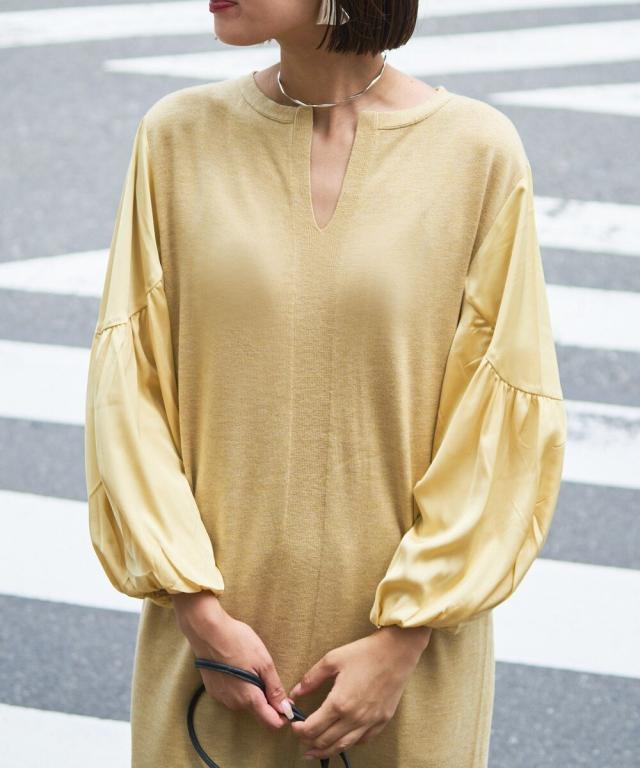 光沢あるバルーンスリーブが華やかな存在感を醸し出す、異素材ニットワンピース