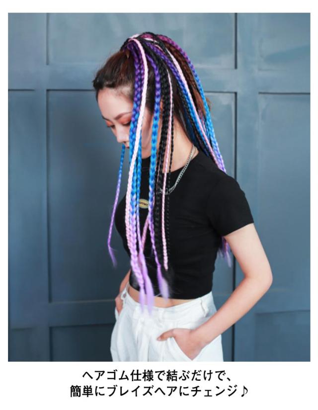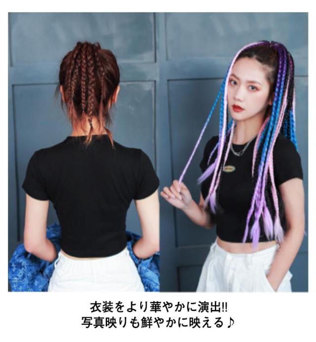 | カラフル派手な24本三つ編みエクステ。華やかさをプラス! へアゴム仕様で結ぶだけで、簡単にブレイズヘアにチェンジ♪ 地毛と一緒に編み込んでもらってもいいし、ポニーテールやツインテールにそのまま付ける事も可愛い。 誰でも簡単に使える、プラスするだけで気分が盛り上がり、華やかさをプラス。 直接髪をカラーリングしないので、大切な髪を傷めることもありません。 お出かけ、お祭り、お誕生日やクリスマス、七五三、ひな祭り、文化祭、運動会、フェスやステージ、コスプレや仮装、ハロウィン等のパーティーやイベントで大活躍♪ 衣装をより華やかに演出!!写真映りも鮮やかに映える♪ | |