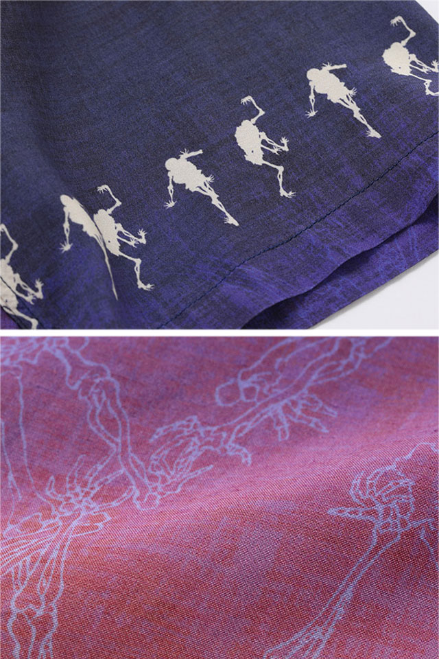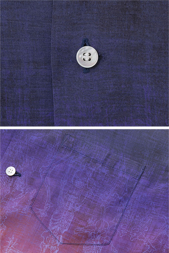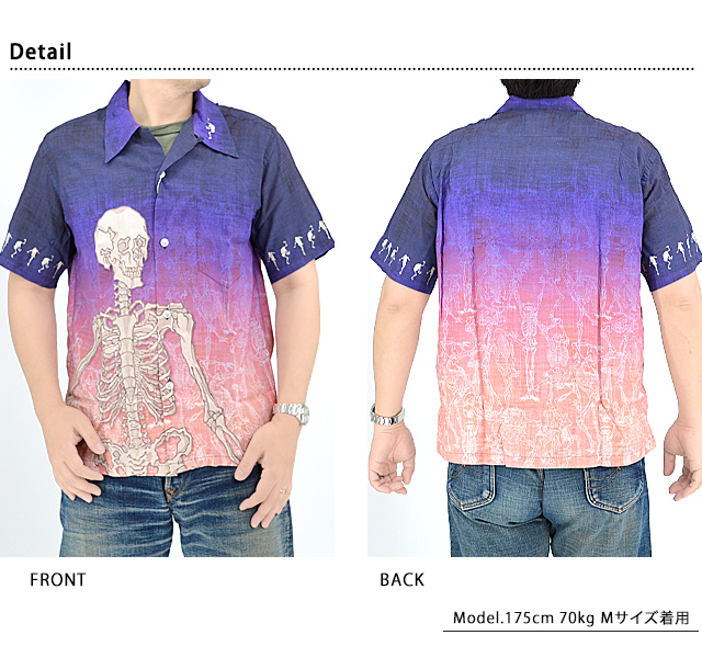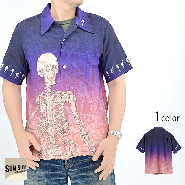 アロハシャツの黄金時代とされる1930〜50年代にかけて作られた「ヴィンテージ」と呼ばれる貴重なアロハシャツを再現し、現代に蘇らせているブランド「SUN SURF」から、SUN SURF × 河鍋暁斎 SPECIAL EDITION 「暁斎漫画」アロハシャツ(SS39128)のご紹介です。 河鍋暁斎「暁斎漫画」幕末から明治にかけて活躍した浮世絵師、河鍋暁斎。 1857年に号の「きょうさい」を名乗り、当初は「狂斎」を使っていたが後に「暁斎」と改めました。 この字からもわかる通り、社会に対しての反発を作品に取り入れ、多くの風刺画を残しています。 その波乱に満ちた絵師としての歴史は6歳から始まり、当時すでに多くの弟子を育てていた浮世絵師、歌川国芳に入門。 そこで人間同士が組み合って喧嘩をしている様を注意深く観察し、動きのひとつひとつを描き出すことを徹底的に学んで自身の才能を開花させていきました。 この「暁斎漫画」に描かれているのは骸骨ですが、そのような人々の骨格の動きが生き生きと描かれています。 サンサーフでは、それらの並びを分解・再構築して躍動感を表現しました。 ボディーには、てろんとした肌触りのなめらかなレーヨンフジェット生地を使用。 左胸には、しっかりと柄合わせされたポケットが縫い付けられています。 ボタンには白蝶貝を採用しました。 アロハシャツは、生産も非常に少なく、レアなアイテムとなっています。 | ||||||||||||||||||||||||||||||