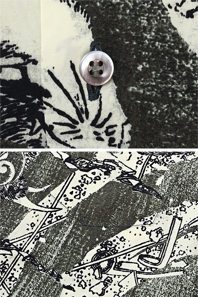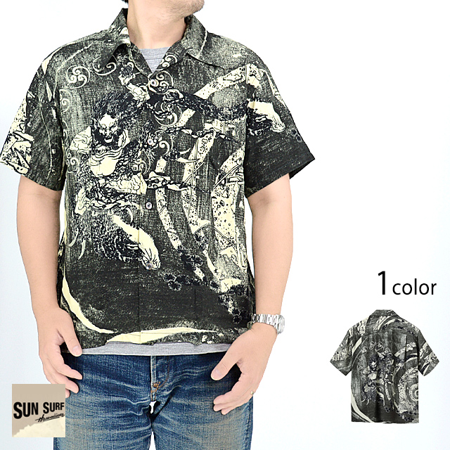 アロハシャツの黄金時代とされる1930〜50年代にかけて作られた「ヴィンテージ」と呼ばれる貴重なアロハシャツを再現し、現代に蘇らせているブランド「SUN SURF」から、SUN SURF × 葛飾北斎 SPECIAL EDITION 「釈迦御一代記図会・六」アロハシャツ(SS39133)のご紹介です。 『釈迦御一代記図会』は釈迦の一生を描いた読本。 本作はその挿絵です。 暴悪な流離王は釈迦の一族を滅ぼした結果、天罰を受け地獄に堕ちました。 北斎はその仏伝の一場面を、左に武器を振り上げて雷撃を落とす雷神、右に爆風渦巻くなか破壊される流離王の王宮を対比させるという、大胆な画面構成で表現しています。 また、古来より描き継がれてきた雷神の姿に則って背後に雷太鼓を描きつつ、乗り物を雲ではなく雷獣に、顔は険しく恐ろしい形相として独自性を発揮。 雷神は神だが、鬼の様態を示すことが多いです。 ボディーには、てろんとした肌触りのなめらかなレーヨンフジェット生地を使用。 左胸には、しっかりと柄合わせされたポケットが縫い付けられています。 ボタンには黒蝶貝を採用しました。 アロハシャツは、生産も非常に少なく、レアなアイテムとなっています。 | ||||||||||||||||||||||||||||||