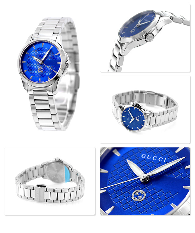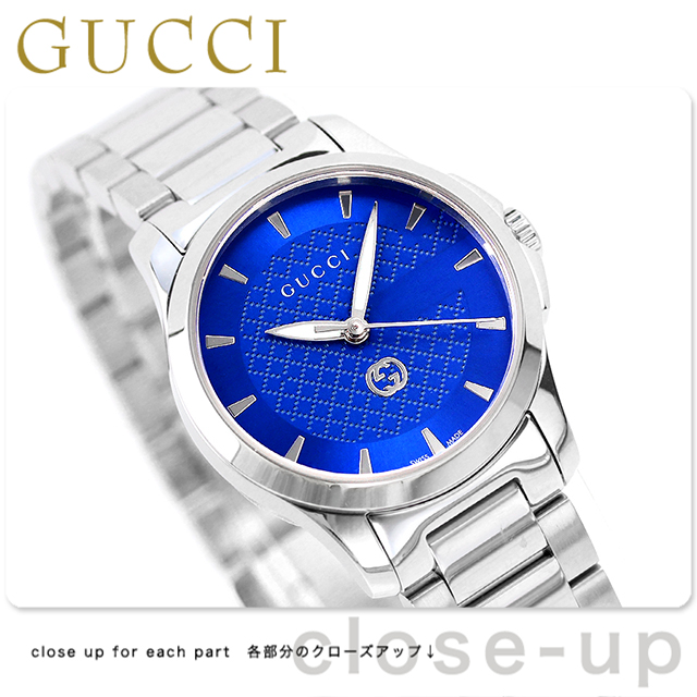 7年保証キャンペーン グッチ Gタイムレス スイス製 FALSE レディース 腕時計 YA1265050 GUCCI アナログ ブルー ◆1921年、グッチオ・グッチは革製品の会社を起業し、フィレンツェに小さな鞄店を開業。ブランドに対する彼のビジョンは、ロンドンと、彼がサボイ・ホテルで働いていた時に見た英国貴族の洗練された審美眼から培われたものです。財布や革製品以外にもアクセサリーや腕時計も品質の高さや、洗練されたデザインが人気で一気に高級ブランドの地位を確立しました。今では名を知らない人はいないぐらい世界的に有名なブランドです。 時代に左右されないクラシカルでスタイリッシュなデザインが特徴のGタイムレスシリーズ。文字盤にはディアマンテパターンとGシャドウを控えめにデザイン。6時位置のGGマークもポイント。スーツスタイルからパーティーシーンまでお使い頂ける、様々なファッションに合わせやすいカラーリングも魅力です。ペアウォッチとしてもおすすめです。