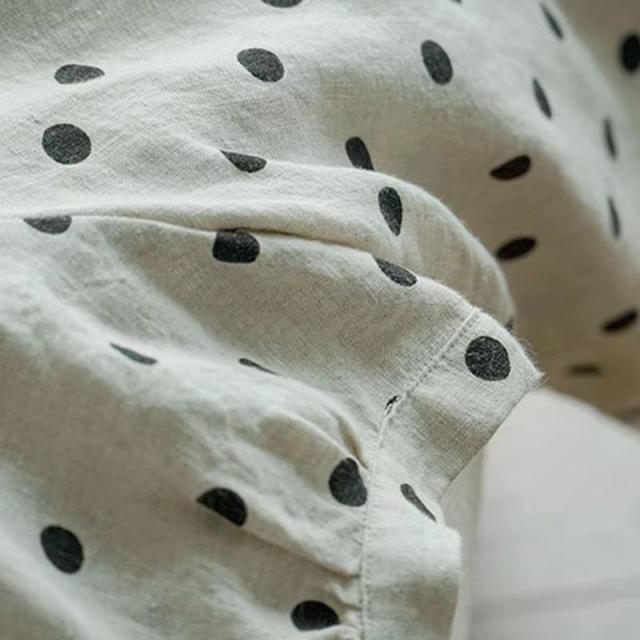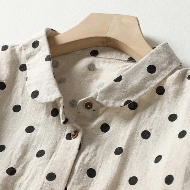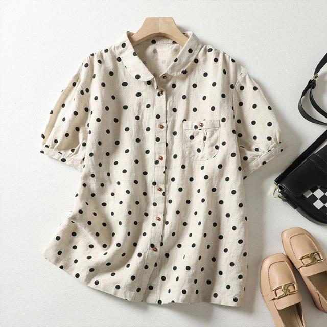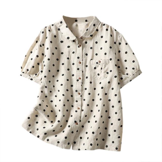 送料無料 半袖シャツ レディース ドット 春 夏 シャツ ブラウス 折り襟 半袖 ドット柄 総柄 トップス 綿麻風 ドットシャツ 体型カバー ゆったり 前開き シンプル おしゃれ