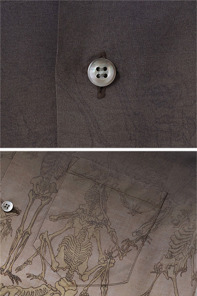 アロハシャツの黄金時代とされる1930〜50年代にかけて作られた「ヴィンテージ」と呼ばれる貴重なアロハシャツを再現し、現代に蘇らせているブランド「SUN SURF」から、SUN SURF × 河鍋暁斎 SPECIAL EDITION 「画鬼狂斎」アロハシャツ(SS39129)のご紹介です。 幼少期より様々なものを観察し、スケッチしてきた河鍋暁斎。 多作の絵師としても知られ、風刺画の他にも絵画や版画など幅広いジャンルの作品を手掛けました。 また、明治時代の前期まで盛んに行われていた「書画会」と呼ばれる展覧会にも多く作品を出品し、精力的に活動。 そして、このシャツの題材にもなっている「暁斎漫画」を1881年に出版することとなります。 享年57歳という短い人生ではありましたが、師匠たちをも唸らせるデッサン力と奇抜な発想によって描き出された戯画や漫画の数々は、現代のアニメーションや漫画の基礎を作ったとされ、多くの支持を受けています。 こちらのデザインではブラックを基調とし、全体的に落ち着いた色のグラデーションを駆使して「暁斎漫画」をプリント。 暗闇から骸骨が浮かび上がる様をアロハシャツに表現しました。 様々なポーズをとり、躍動感あふれるタッチで描かれた骸骨たちが立ち並ぶ情景は、見る者に強烈な印象を残します。 ボディーには、てろんとした肌触りのなめらかなレーヨンフジェット生地を使用。 左胸には、しっかりと柄合わせされたポケットが縫い付けられています。 ボタンには黒蝶貝を採用しました。 アロハシャツは、生産も非常に少なく、レアなアイテムとなっています。 | ||||||||||||||||||||||||||||||