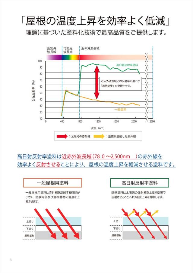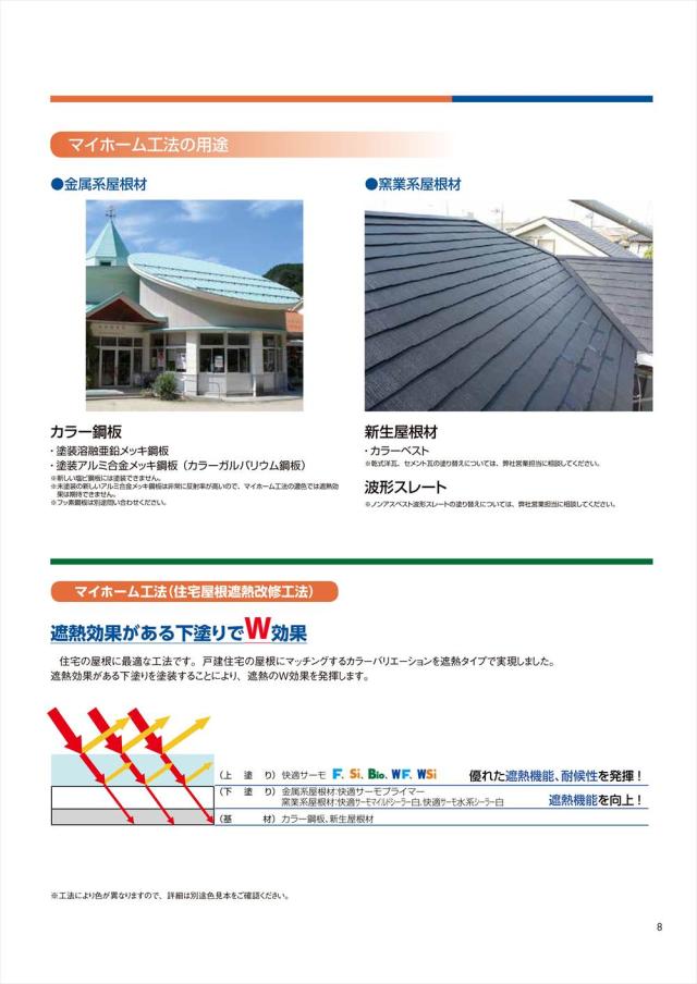 住宅の屋根に最適な工法です。戸建住宅の屋根にマッチングするカラーバリエーションを遮熱タイプで実現しました。 遮熱効果がある下塗りを塗装することにより、遮熱のW効果を発揮します。