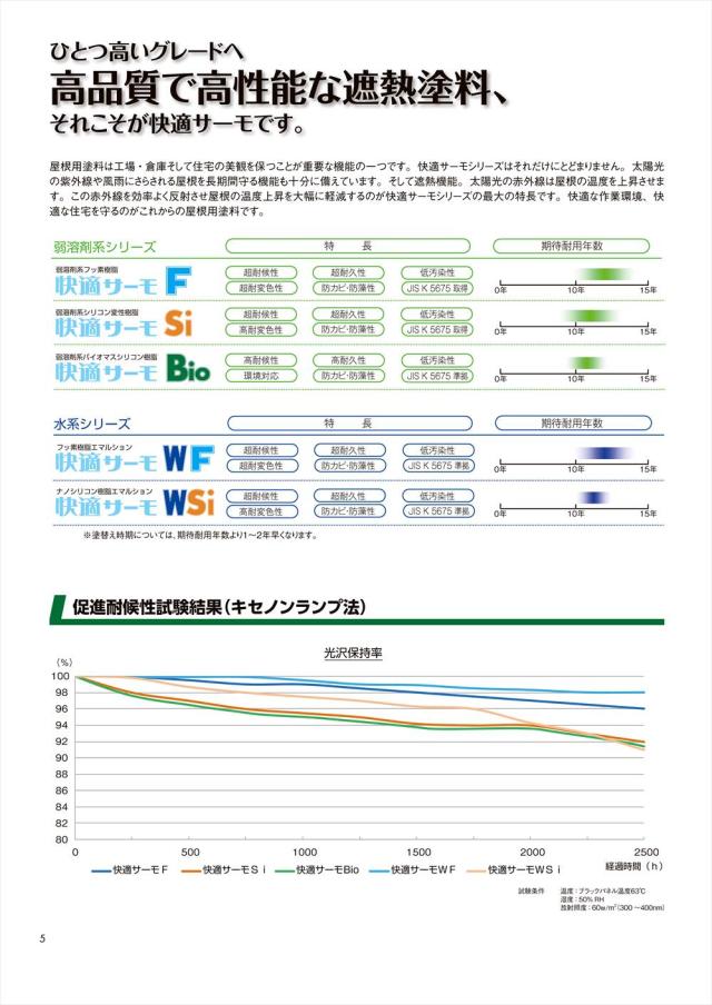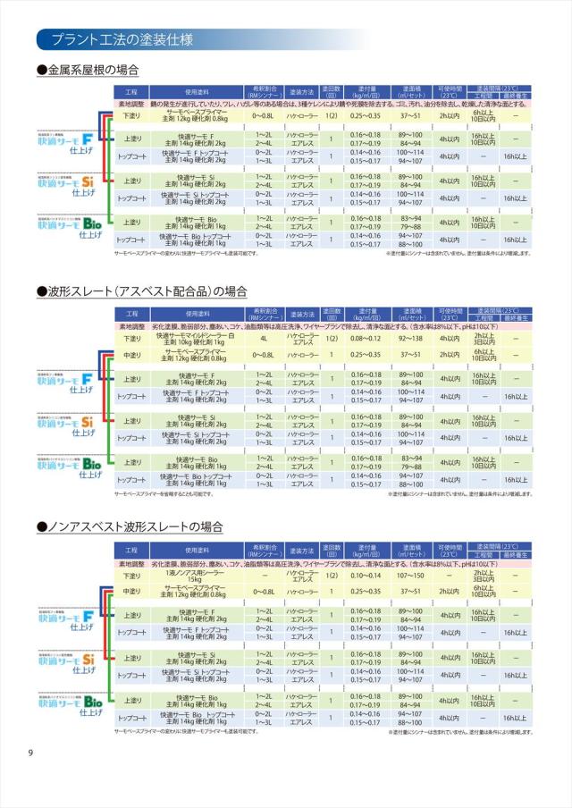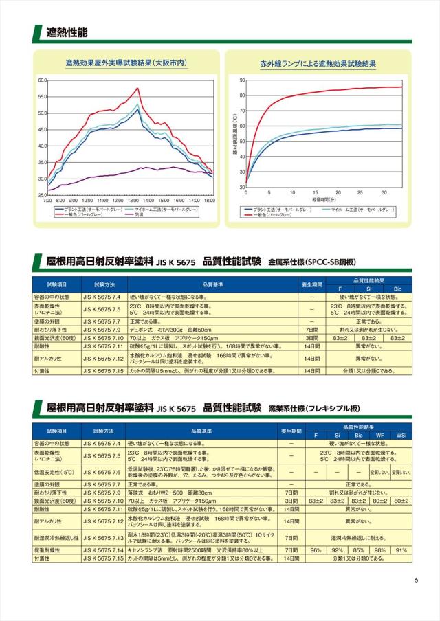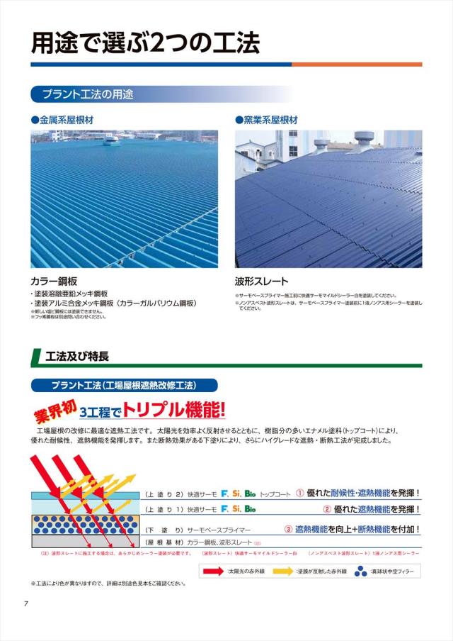 工場屋根の改修に最適な遮熱工法です。太陽光を効率よく反射させるとともに、樹脂分の多いエナメル塗料(トップコート)により、優れた耐候性、遮熱機能を発揮します。また断熱効果がある下塗りにより、さらにハイグレードな遮熱・断熱工法が完成しました。