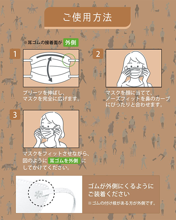 | ご使用方法 | 1.マスクの上下を確認して、左右に広げます。 2.耳ゴム部分を伸ばし、マスクを両耳にかけます。 3.マスクの位置を調整し、隙間がないよう着用してください。 |