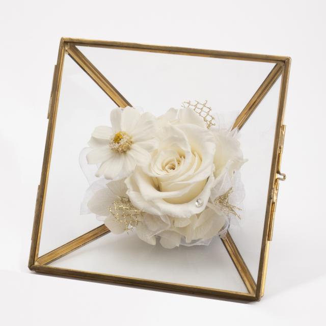 ガラスのフレームに入ったハイセンスなデザインのプリザーブドフラワーです。