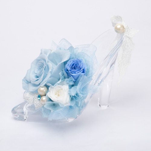アクリル製のヒール型の器にデザインされたプリザーブドフラワーです。