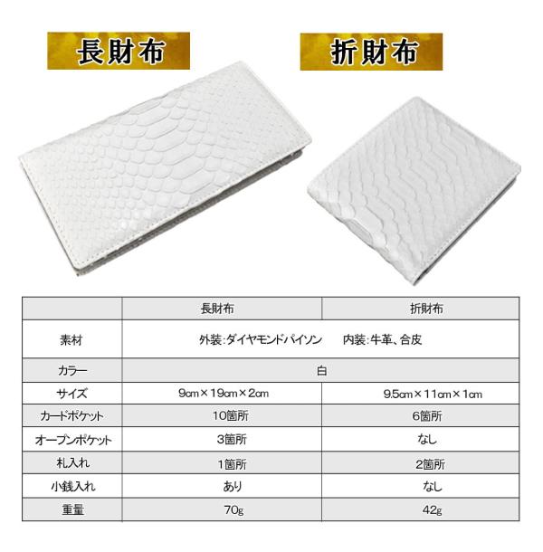 【タイプ】白蛇長財布、白蛇折財布【製品仕様】[長財布]■サイズ(約):9×19×2cm■重量(約):70g■素材:(表側)ダイヤモンドパイソン、(中側)牛革、合皮■仕様:カード入れ×10、オープンポケット×3、札入れ×1、小銭入れ(ファスナータイプ)×1■生産国:ベトナム[折財布(二つ折り財布)]■サイズ(約)9.5×11×21cm■重量(約):42g■素材:(表側)ダイヤモンドパイソン、(中側)牛革、合皮■仕様:カード入れ×6、オープンポケット無し、札入れ×2、小銭入れ無し■生産国:ベトナム