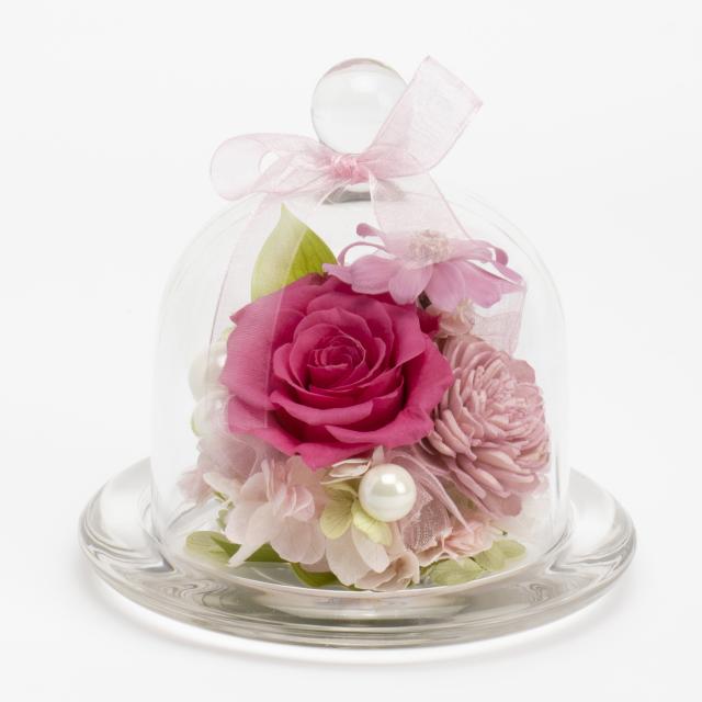 ガラスドームでお花を優しく包み込んだデザインのプリザーブドフラワーです。