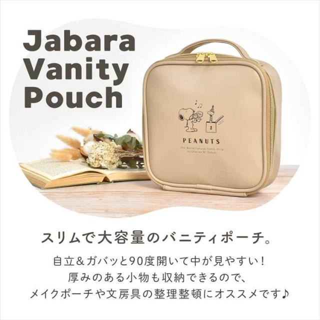 スヌーピーデザインのスリムで大容量なバニティポーチ。自立して大きく開き中が見やすく、厚みのある小物も収納可能。軽量で持ち運びやすく、汚れに強い合皮&ビニール加工でお手入れも簡単。メイクや文房具の整理におすすめです。