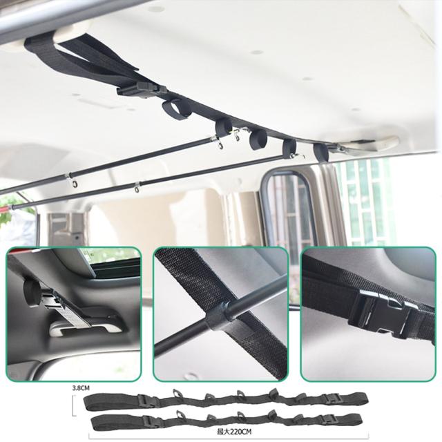 【 ロッドホルダーサイズ】最大釣り竿の搭載数:5本。釣り竿ラックは最大5本の釣り竿を保持し、ロッドを邪魔にならないように保つことができます。【 簡単に取付ける】車内の両サイドにあるつり革に通すだけで簡単に装着できるロッドホルダーです。取付部分はバックルになってますので取付・取り外しも簡単です。