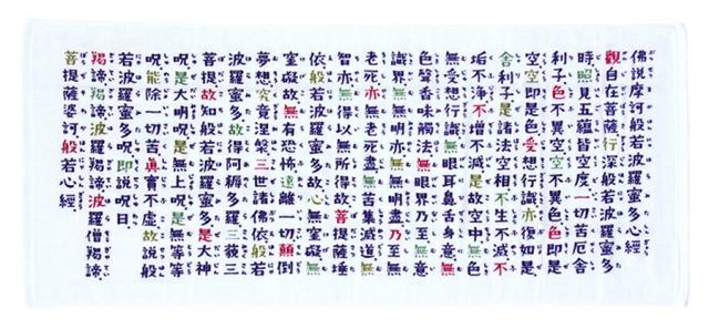 般若心経がたおるになりました。表はガーゼ地、裏はパイル地の二重仕立てで肌触り抜群の手拭いたおるです。汗拭きや、アウトドアなど毎日の生活に使えるアイテムです。