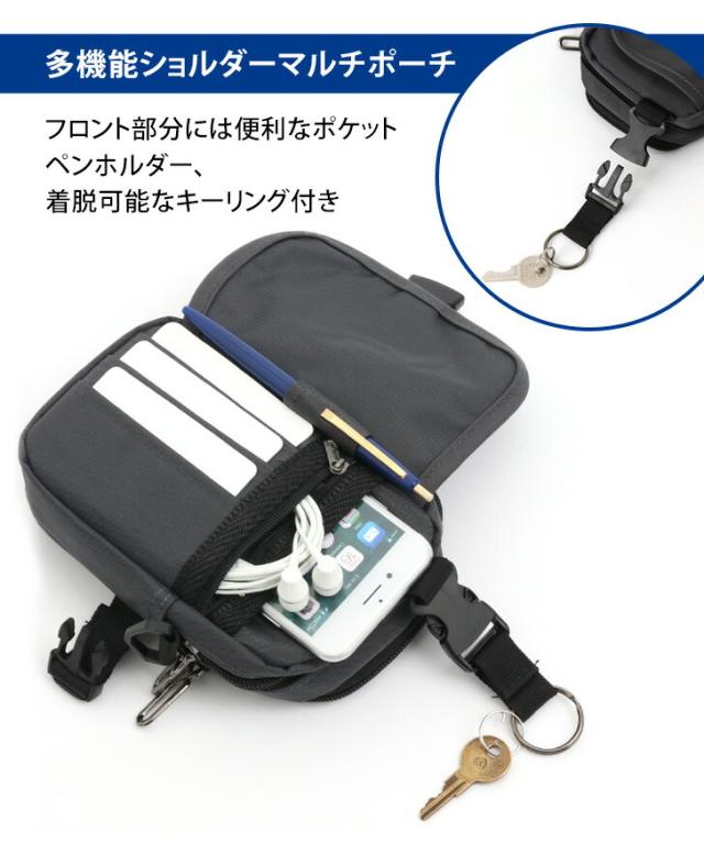 フロント部分には便利なポケット、ペンホルダー、着脱可能なキーリング付き。