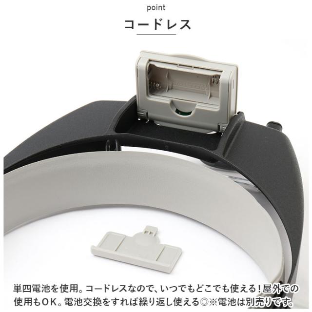 | 商品説明 | 2つのLEDライトで手元を明るく照らして、メガネ型ルーペでハンズフリー◎「ルーペ メガネ型 LEDライト付き」が登場。 【ハンズフリー&LEDライト付き】 ・メガネ型のルーペなので簡単着用◎両手が自由に使えるので作業がはかどる!角度調節可能なLEDライトが手元を明るく照らし、暗い場所や細かい作業に最適◎ 【倍率UPレンズつき】 2重のメインレンズの他に倍率をアップするレンズが2枚ついているので、用途に合わせて調節できる。 ・※メインレンズ:1.5倍、補助レンズ:6倍、8倍 【レンズの角度調節が可能】 ・レンズを上にあげれば、レンズなしの状態で視界が広がる。作業中に手元から目を離し、遠くを見たいときにも本体はつけたままでOK。 【コードレス】 ・単四電池を使用。コードレスなので、いつでもどこでも使える!屋外での使用もOK。電池交換をすれば繰り返し使える◎ ・※電池は別売りです。 【サイズ調節OK】 ・ヘッド部分はアジャスターつきでサイズ調節可能!頭にフィットし安定する。 【使用シーンいろいろ】 ・時計の修理や、趣味のプラモデル作りなど、精密作業を行うシーンで活躍。お仕事からプライベートまで使える♪ |