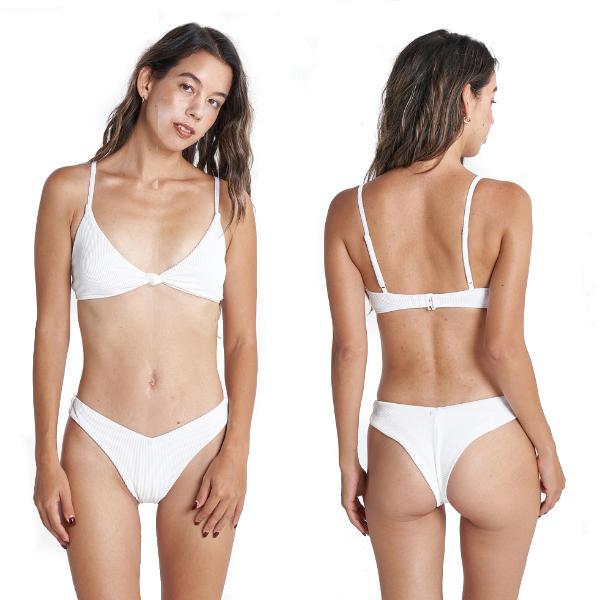 | | 毎シーズン人気の、リブ素材を使用したソリッドカラーのスイムウエア。しっかりした生地感が、シンプルながら高見えが叶う一着です。ブラのフロント部分がノットになったデザイン。ハイレグカットのボトムが、スタイルよく見せてくれます。リサイクルナイロン素材を使用したエココンシャスなスイムウエアです。 |