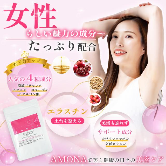 AMONAの美容サプリメントは、年齢に応じた美しさと健やかな毎日をサポートするために開発されました。カツオ由来のエラスチンや魚由来コラーゲンペプチドをはじめ、馬プラセンタエキス、大豆イソフラボン、ヒアルロン酸、セラミドなど、美容分野で注目される成分をバランスよく配合。ハリ・ツヤ・うるおいを意識したい方におすすめのインナーケアです。