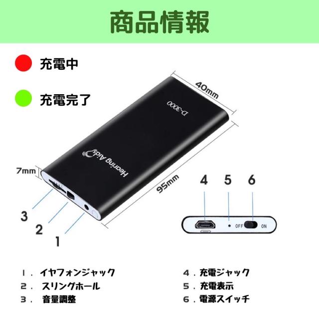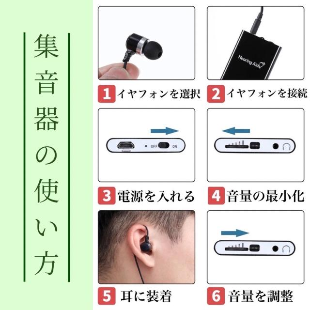 1. イヤホンを本体にさす 2. 電源をON 3. 集音器を装着 4. 装着後、ボリュームを上げます 5. 使用後、集音器を外し充電します |