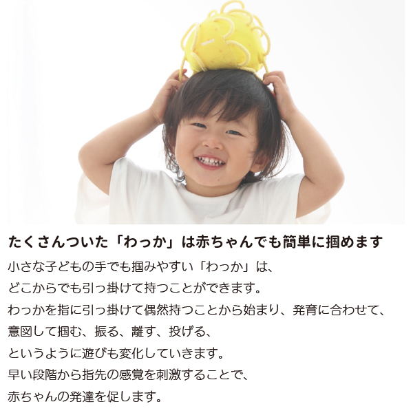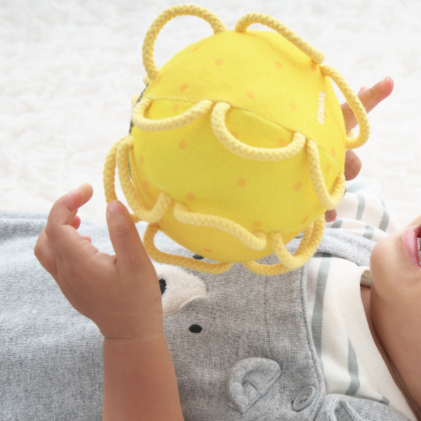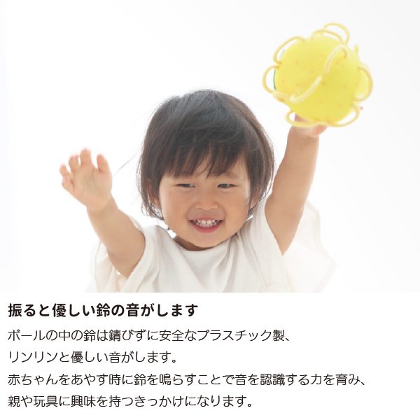 初めのうちは掴むというよりは、引掛かって偶然持ててしまうという段階からスタートし、意図して掴む、振る、離す、鈴の音を認識する、投げるというように発育に合わせて遊びも変化していきます。