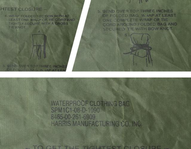 米軍で使用されていたWATERPROOF CLOTHING BAG(クロージング バッグ)が入荷しました。耐久性のあるナイロン素材にゴム引きの裏地になっていますので、バッグ内は水に濡れずに防水の衣類バッグとして使用されていたアイテムです。ダッフルバッグやアリスパックの中に収納して使用するバッグで、衣類はもちろん、濡らしたくない荷物や寝袋などをドライな状態で収納するように設計されています。湿気や水の侵入を防ぐために本体上部に紐が付属しています。本体には図入りでバッグの絞り方も記載してありデザインのアクセントになっています。