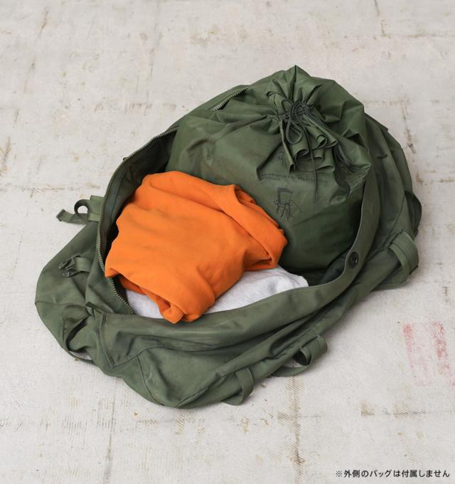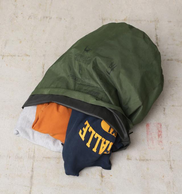米軍で使用されていたWATERPROOF CLOTHING BAG(クロージング バッグ)が入荷しました。耐久性のあるナイロン素材にゴム引きの裏地になっていますので、バッグ内は水に濡れずに防水の衣類バッグとして使用されていたアイテムです。ダッフルバッグやアリスパックの中に収納して使用するバッグで、衣類はもちろん、濡らしたくない荷物や寝袋などをドライな状態で収納するように設計されています。
