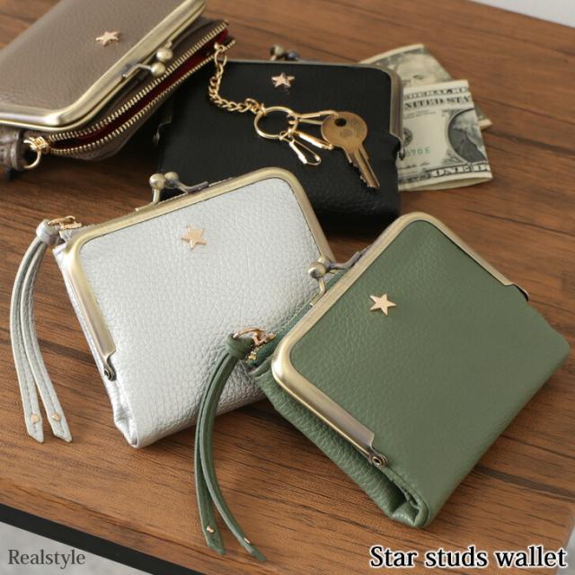 スタースタッズ がま口 二つ折り財布 レディース コンパクト かわいい 小さい L字ファスナー 小さい財布 ミニ財布 小銭入れ コインケース カードケース カード入れ 札入れ お札が折れない お札を折らない 小さめ おしゃれ キーリング