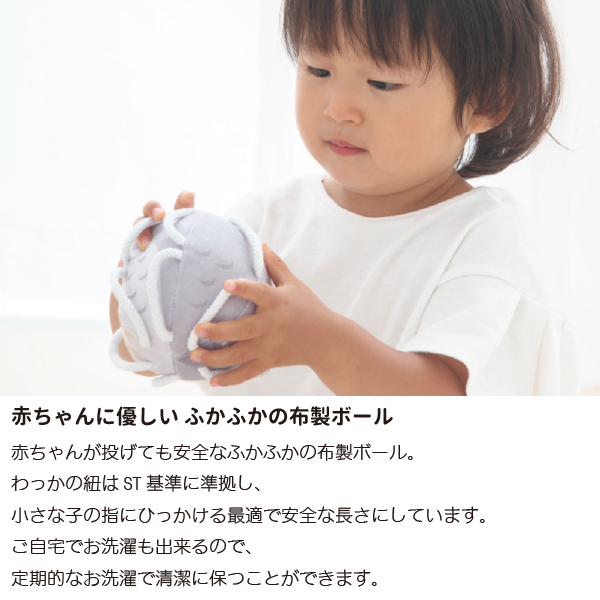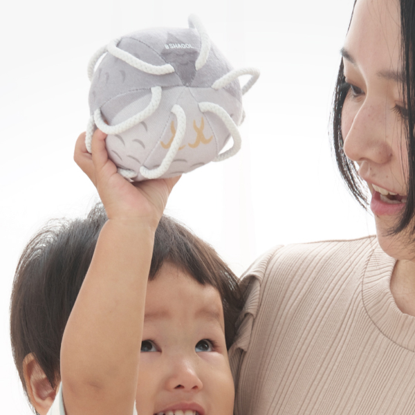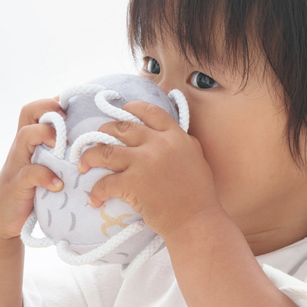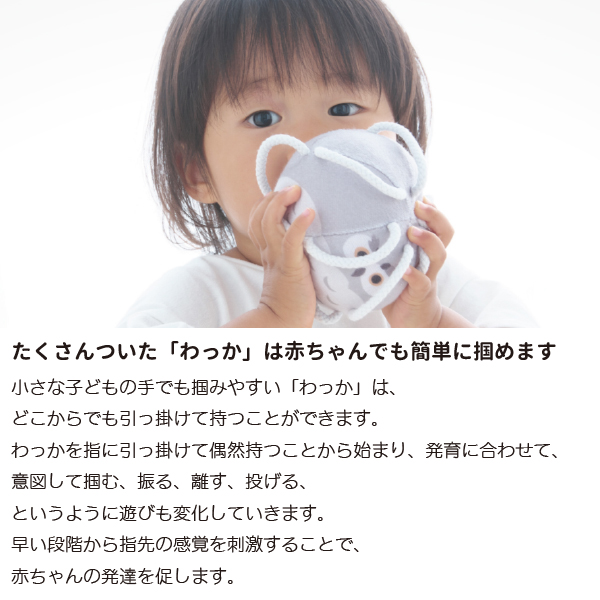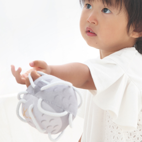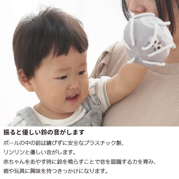 初めのうちは掴むというよりは、引掛かって偶然持ててしまうという段階からスタートし、意図して掴む、振る、離す、鈴の音を認識する、投げるというように発育に合わせて遊びも変化していきます。