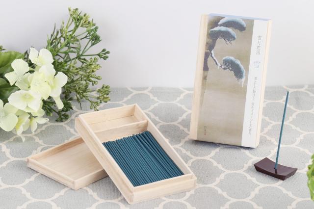 桐箱入りのお線香は、お香としてもお使頂けるよう雪をイメージした香りをセレクトさせていただきました。