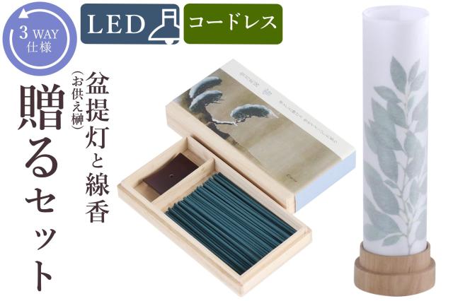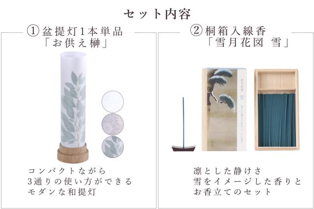 人気のコードレス・LED・ミニサイズのお盆提灯と雪をイメージした香りのお線香を組み合わせた当店オリジナルの組み合わせ。