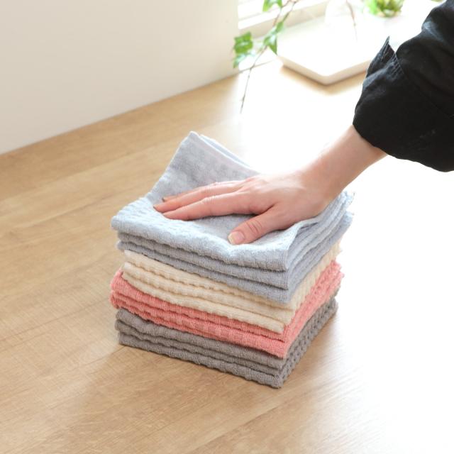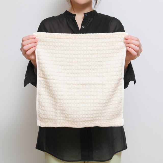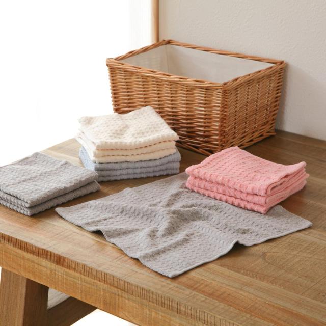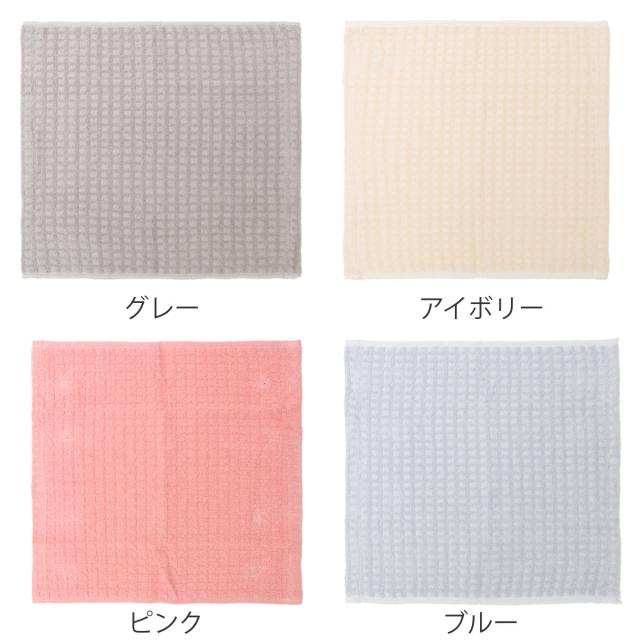 撚りをかけないふわふわの糸で織り上げた無撚糸のハンドタオルです。ワッフル調の柄がオシャレなデザインで使いやすい4色展開なので、ご家庭でお使い頂くのに最適です。