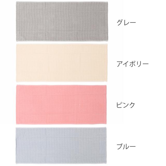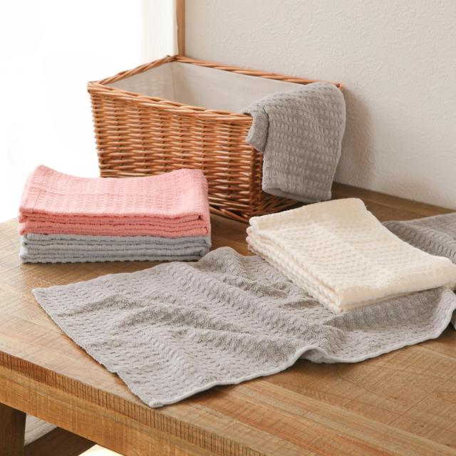 撚りをかけないふわふわの糸で織り上げた無撚糸のフェイスタオルです。ワッフル調の柄がオシャレなデザインで使いやすい4色展開なので、ご家庭でお使い頂くのに最適です。