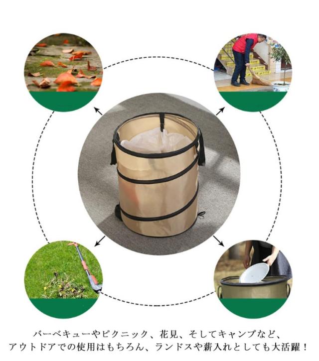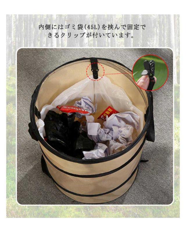 | 大容量91L!ポップアップ(折り畳み)式のトラッシュボックスです。 ポップアップ式だから簡単に展開と収納が可能! 家庭用ゴミ袋の91Lサイズに対応。大容量だからこまめに取り換える必要なし! サイドのバックルを外せばポップアップで自立して、オシャレにゴミ袋を目隠ししてくれます。 折り畳み式のコンパクトなデザインで、使わない際は収納が簡単です。 オックスフォード防水生地を使用!バーベキューやピクニック、花見、そしてキャンプなど、アウトドアでの使用はもちろん、ランドスや薪入れとしても大活躍! キャップギアの収納やランドリーバッグなど、ゴミ箱以外にも、使い方が広がるアイテムです。 | |