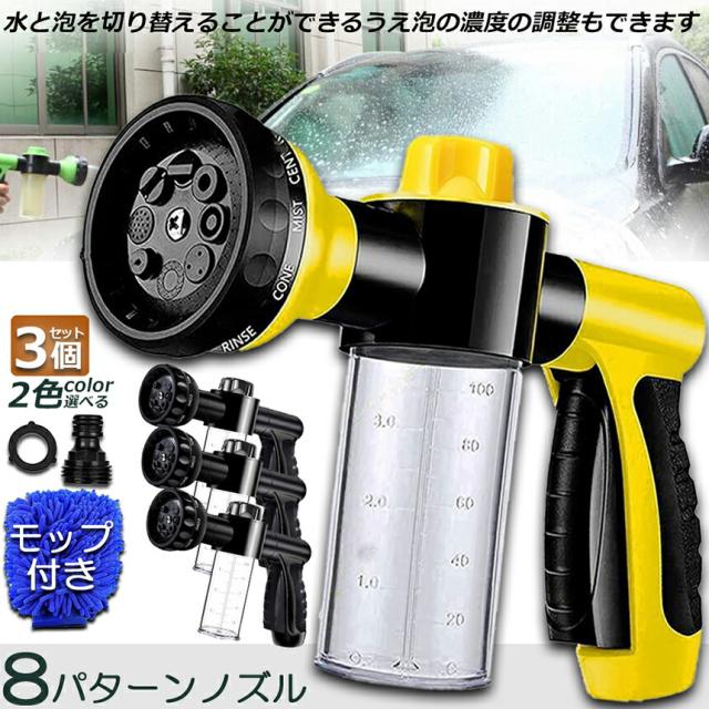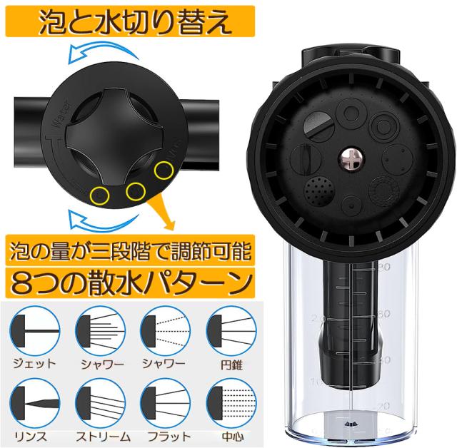 洗車フォームガン 洗車ノズル フォームガ 3点セット 泡洗浄 散水パターン8種類 タンク付き 散水コンパクトノズル 水と泡切り替え 2in1 水量 洗剤量調整 手元止水スイッチ付き 自動車 水やり 簡単 洗車 庭 ガーデン キッチン エアコン 大掃除用 洗