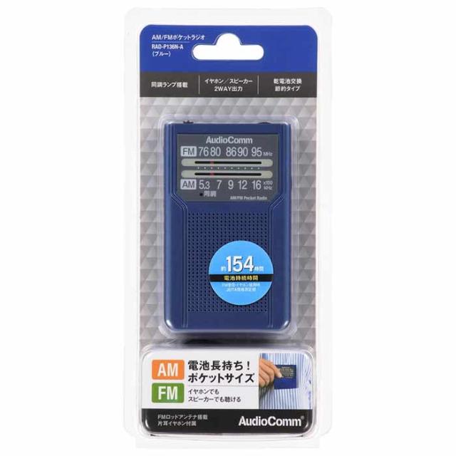 ポケットラジオ 電池長持ち154時間 2WAY出力 モノラル受信 ワイドFM 片耳イヤホン付属 単4形×2本使用 ブルー OHM RAD-P136N-A