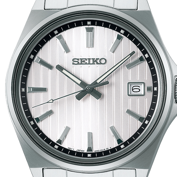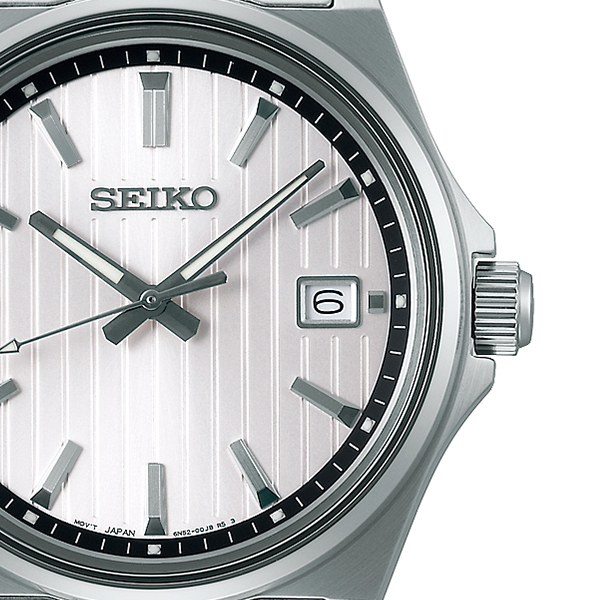 ケースは、大胆に平面を組み合わせたソリッドな形状にすることで、スタイリッシュなデザインに仕上げました。金属製のダイヤルリングに刻まれた秒目盛、12箇所のバーインデックスが、スタイリッシュながらもスタンダードさを感じさせます。ダイヤルは、金属ダイヤルならではの質感を活かした縦ストライプの型打ちを施すことで、上質かつスタイリッシュな印象です。