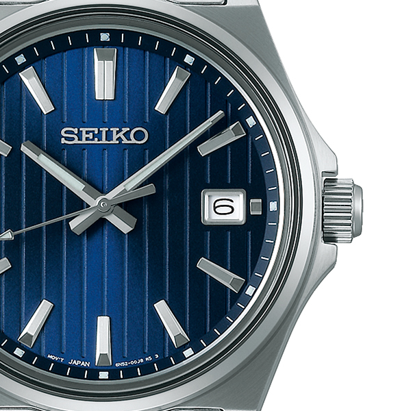 ケースは、大胆に平面を組み合わせたソリッドな形状にすることで、スタイリッシュなデザインに仕上げました。金属製のダイヤルリングに刻まれた秒目盛、12箇所のバーインデックスが、スタイリッシュながらもスタンダードさを感じさせます。ダイヤルは、金属ダイヤルならではの質感を活かした縦ストライプの型打ちを施すことで、上質かつスタイリッシュな印象です。