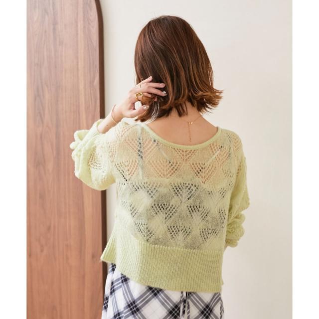 花柄のような透かし編みが大人ガーリーなムードを高めるカーディガン。