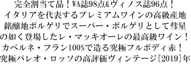 完全割当て品!WA誌98点&ヴィノス誌96点!イタリアを代表するプレミアムワインの高級産地銘醸地ボルゲリでスーパー・ボルゲリとして彗星の如く登場したレ・マッキオーレの最高級ワイン!カベルネ・フラン100%で造る究極フルボディ赤! 究極パレオ・ロッソの高評価ヴィンテージ[2019]年■さまざまなギフトアイテムをご用意しております。