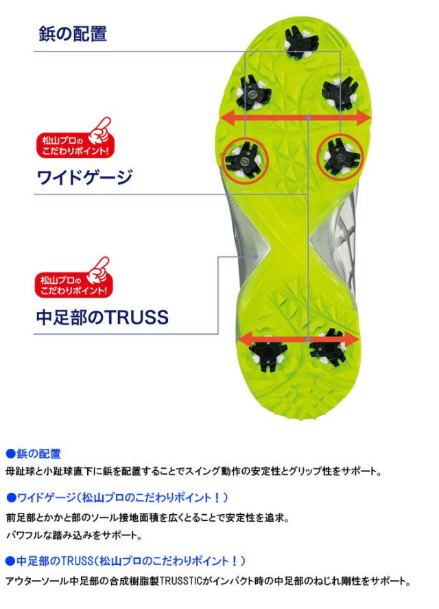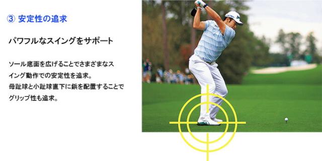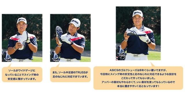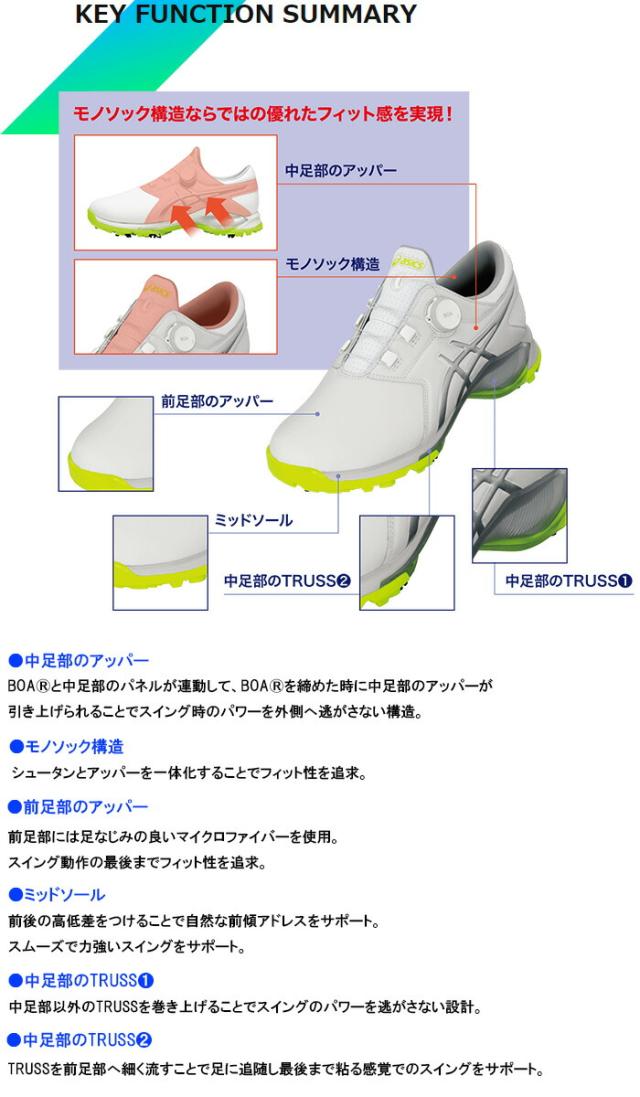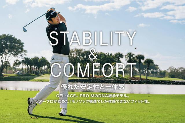 松山英樹選手監修、GEL−ACEPROMのBOAフィットシステムモデル。前足部とかかと部の接地面積を広げることで、パワフルな踏み込みをサポート。シュータンとアッパーが一体化したモノソック構造を採用しており、スウィング動作の最後まで足へのフィット感を追求。