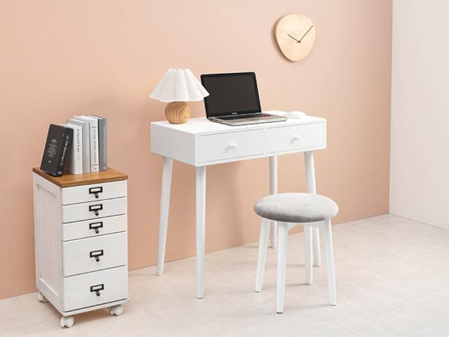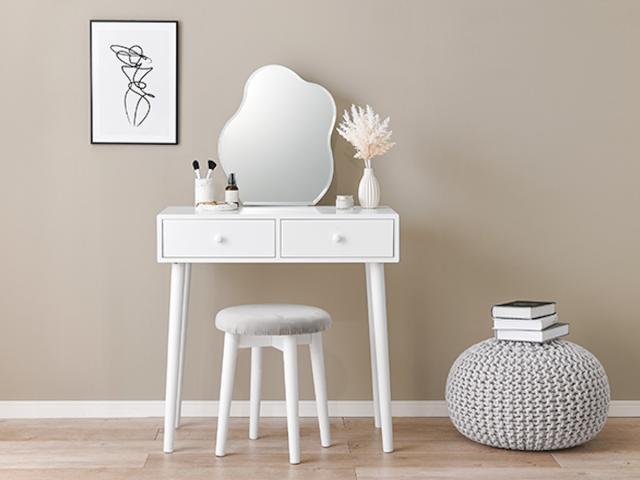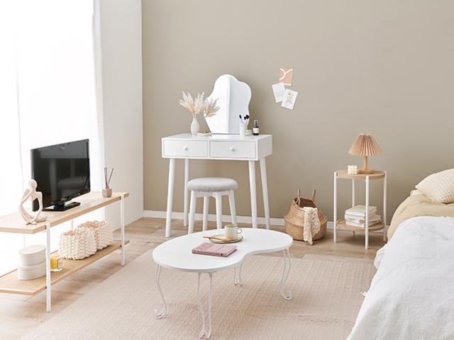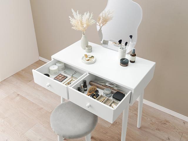 シンプルな形と大きすぎないサイズ感で、ワンルームのお部屋に置いてもスッキリとした印象になります。コンパクトサイズながら、ちょうど良い広さの天板なので、化粧品を広げてゆったりとメイク時間を楽しむことができます。