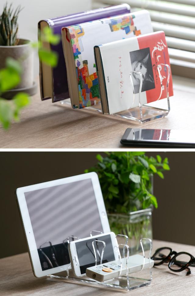 横置きで使うとリモコン以外のモノのスタンドとして利用できます。お気に入りの本を収納するブックスタンドとしてや、タブレットやスマートフォンなどのガジェット類をまとめて収納するスタンドととしてもお使いいただけます。