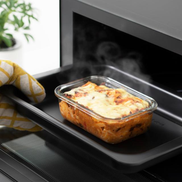 ガラス容器の耐熱温度は約600度です。ラザニアやグラタンなどオーブンでの調理器具としても使用可能です。