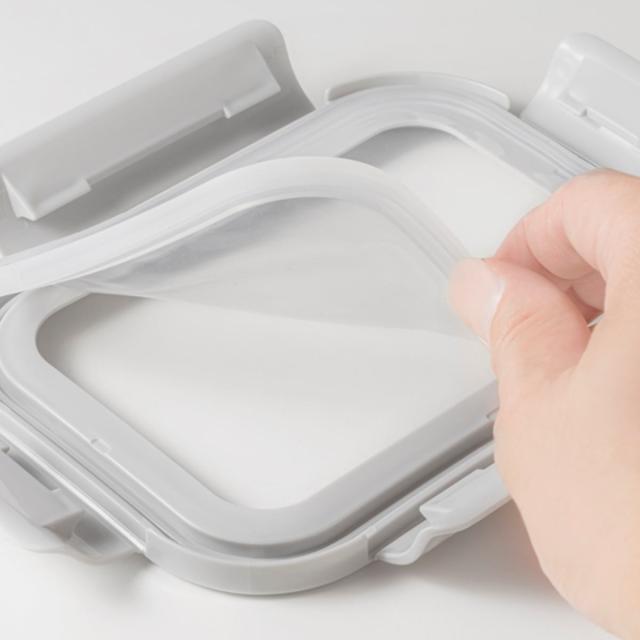 シリコン蓋が伸びるので、満容量の130%まで収納可能です。はみ出してしまったおかずや野菜も、まるでラップのように優しく包み込んで、蓋をして保存することができます。