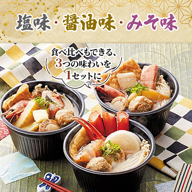 ・「塩味」「醤油味」「みそ味」の3種類が各1個ずつ入った計3個セット(具材とスープ入り)。