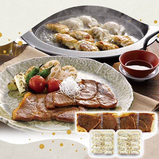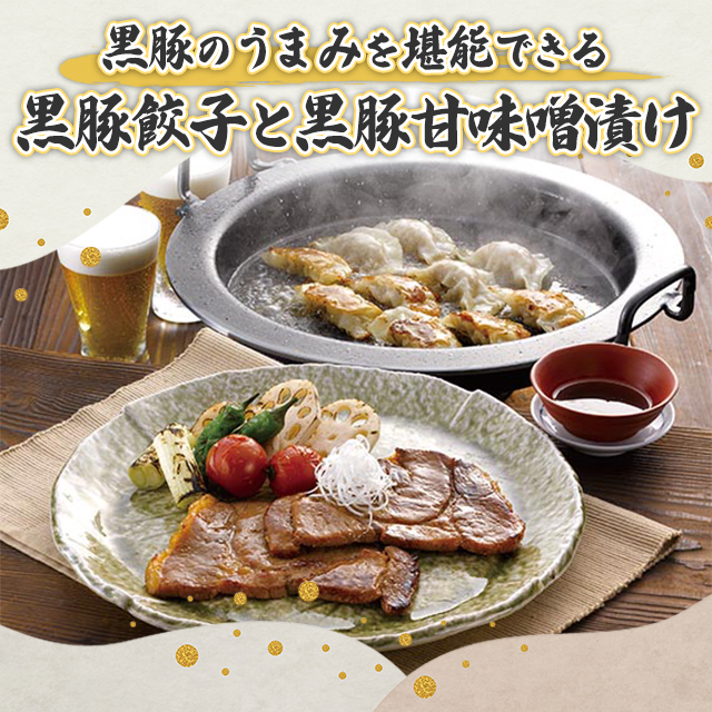 ・黒豚のおいしさが詰まったジューシーな餃子と、黒豚のもも肉をコクのある甘味噌だれで漬けた甘味噌漬けをセット。