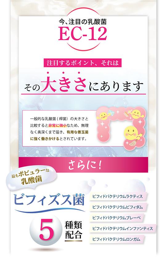 話題の乳酸菌EC-12と生きた酪酸菌をダブルで配合しました。その他にも種類豊富な乳酸菌と食物繊維、オリゴ糖を配合。あなたにピッタリの乳酸菌がきっと見つかります。