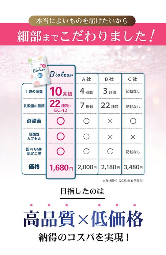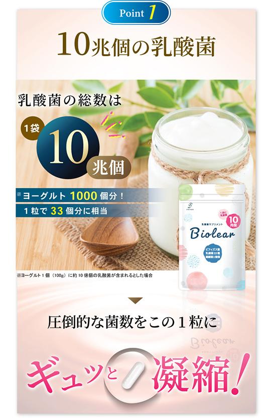 | 特徴 | 【圧倒的な総菌数】 乳酸菌は23種10兆個、生きた酪酸菌も1億個配合し、あなたの腸活をしっかりサポートします。 【厳選成分EC-12と酪酸菌を配合】 話題の乳酸菌EC-12と生きた酪酸菌をダブルで配合しました。その他にも種類豊富な乳酸菌と食物繊維、オリゴ糖を配合。あなたにピッタリの乳酸菌がきっと見つかります。 【腸まで届く耐酸性カプセル】 Biolearは打錠でもソフトカプセルでもなく耐酸性カプセルを採用しています。大切な菌たちをしっかりと腸まで届けます。 |