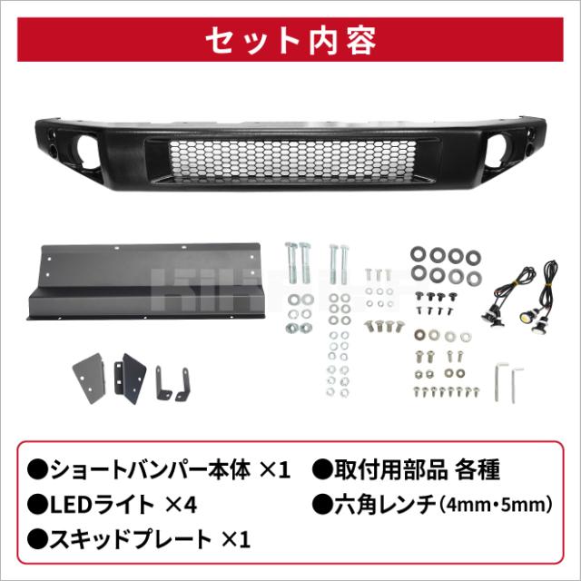 | セット内容 | ・ショートバンパー本体×1 ・LEDライト×4 ・スキッドプレート×1 ・取付用部品 各種 ・六角レンチ(4mm・5mm) |