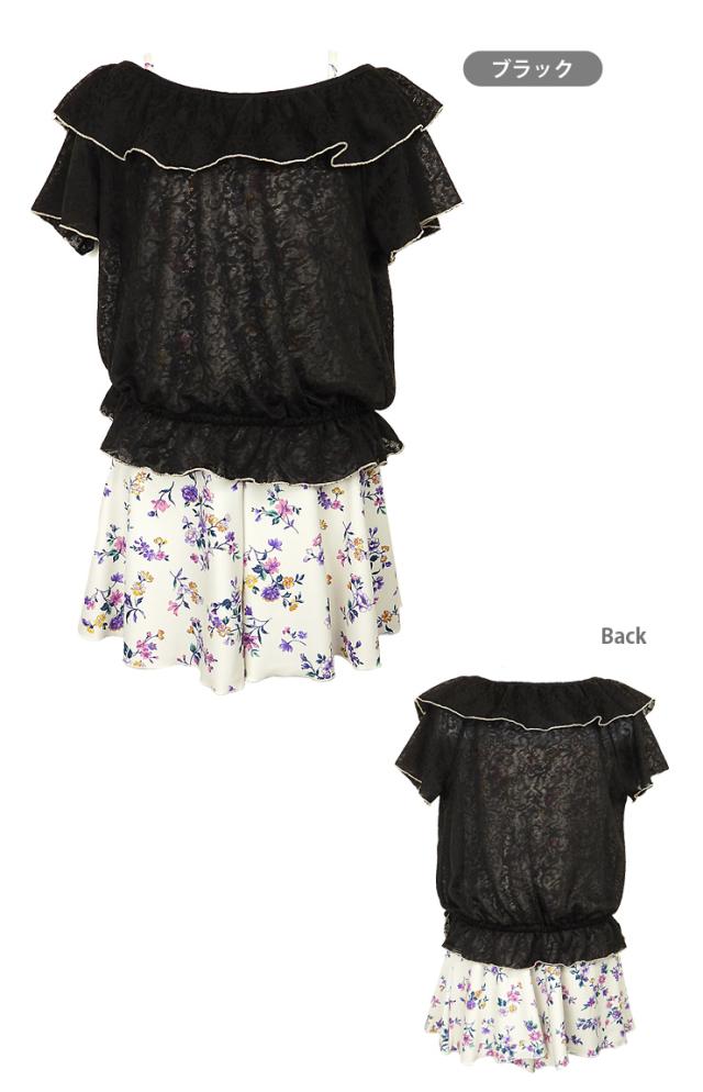 レースのトップスと、花柄の大人っぽくて落ち着いたデザインのサロペットのセットです。