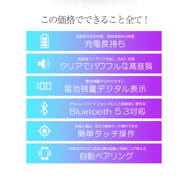 セット内容 :Bluetoothイヤホン / 専用充電ケース /イヤーキャップ(S・M・L)※Mはイヤホン本体に装着済/ 充電用ケーブル(約30cm)/ 取扱説明書兼保証書